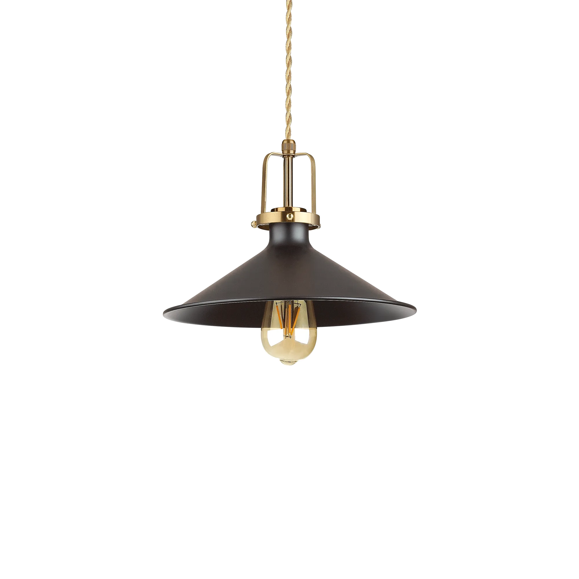 Monture en métal avec pavillon et diffuseur vernis en blanc ou noir mat. Détails avec finition en or satiné. Câble électrique torsadé recouvert en tissu.