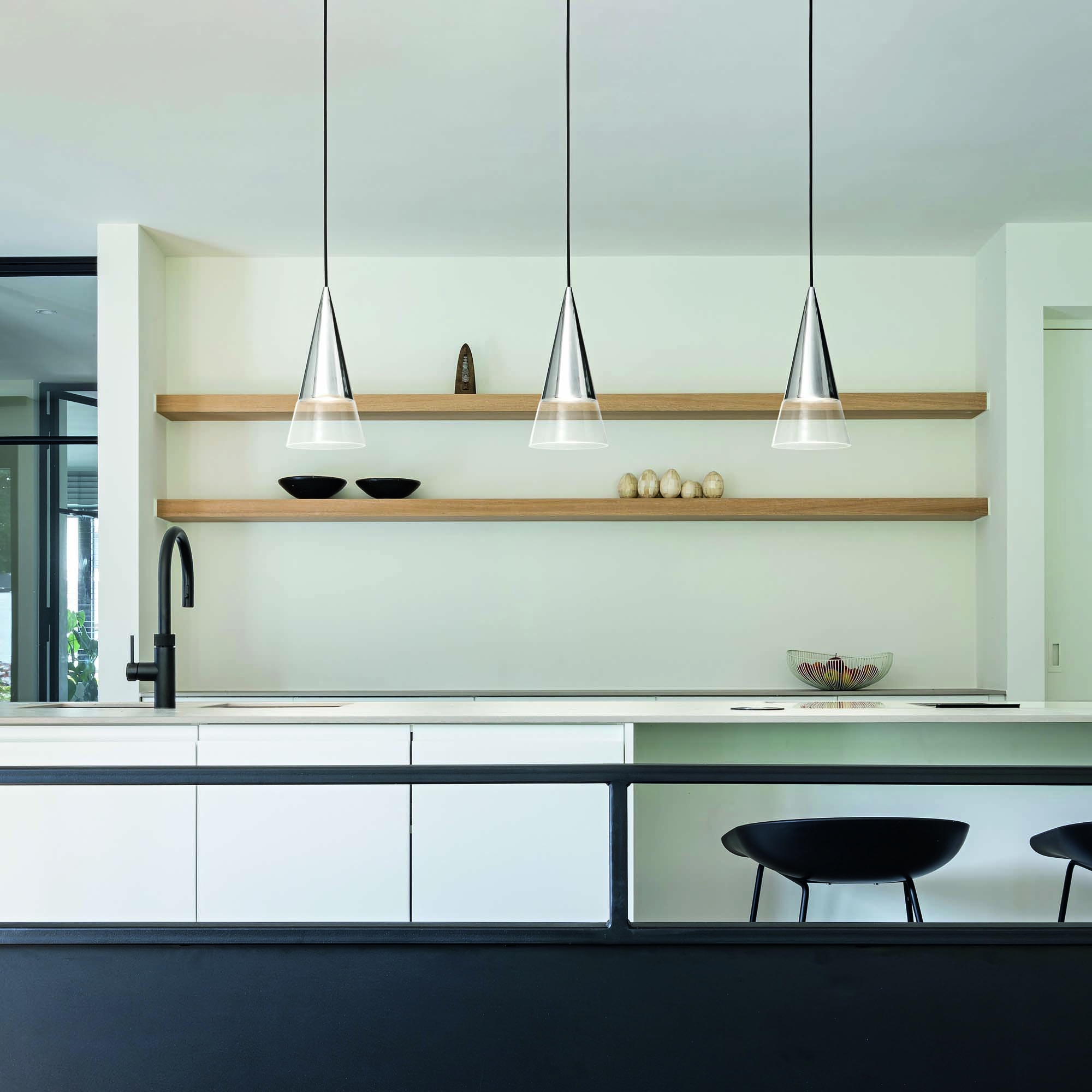 Rosone e montatura in metallo placcato. Diffusore in vetro soffiato trasparente. Cavo in pvc. Colori: Cromo con diffusore smerigliato, nickel o ottone.