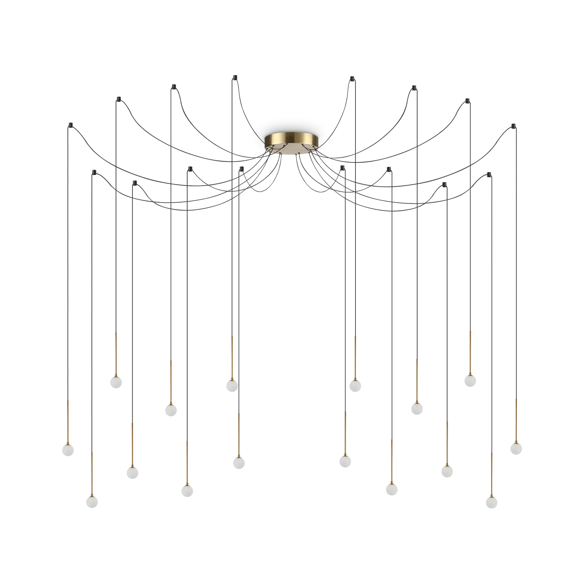 Rosone e corpo luce sospeso in metallo verniciato a polveri o placcato. Diffusore sferico in acrilico satinato. Cavi in pvc con supporti a soffitto in alluminio. Colore: ottone o nero.