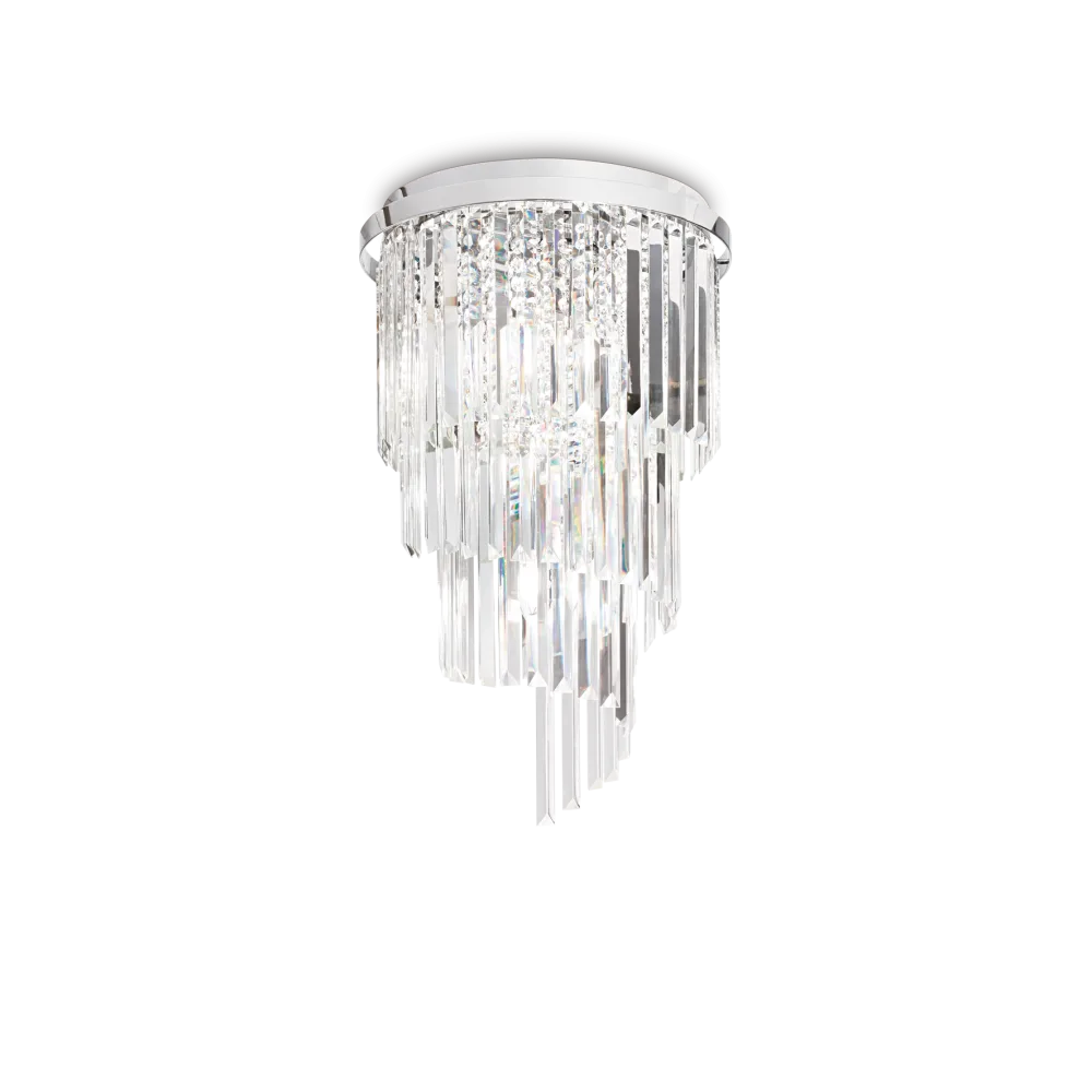 Montatura in metallo con finitura disponibile in cromo o dorato. Pendagli con ottagoni e sfere in cristallo molato.