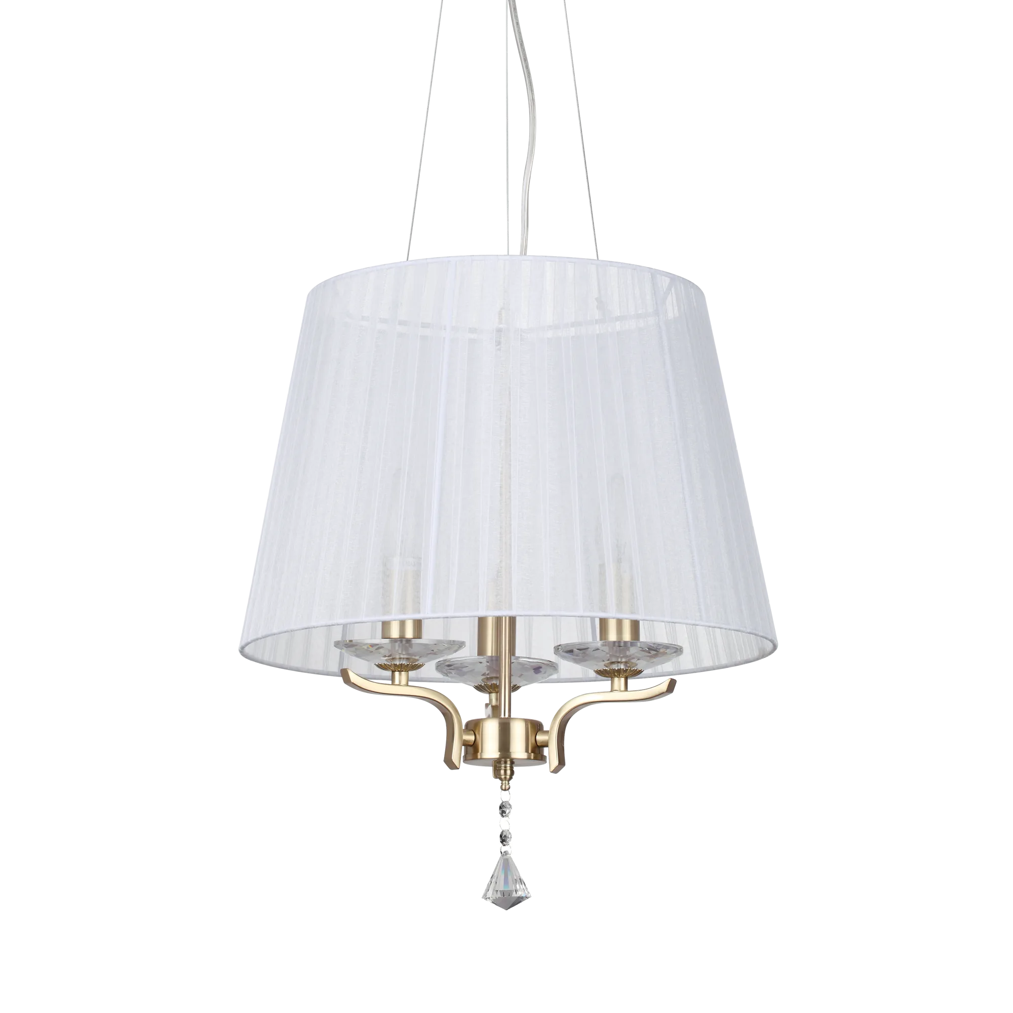 Montatura in metallo cromato oppure ottone satinato. Corpo centrale, bobeches e pendagli in cristallo molato. Paralumi in organza. Copricatena in velluto.