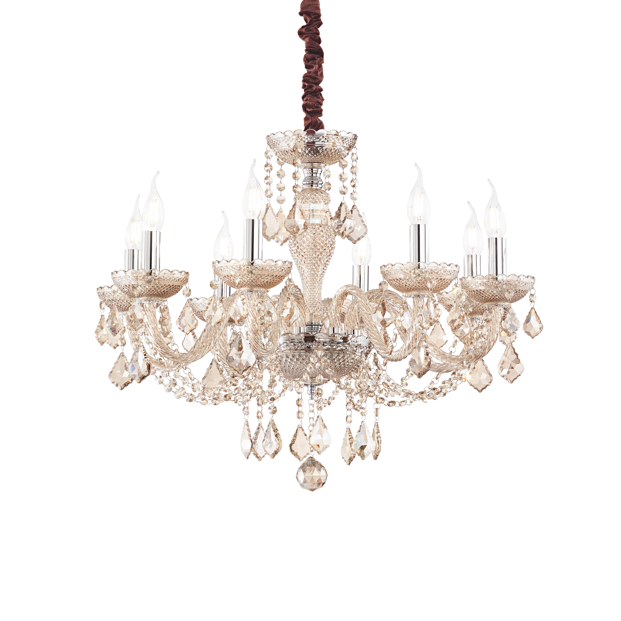 Lampadario in vetro soffiato con dettagli in metallo cromato. Ottagoni e gocce in cristallo molato. Copricatena in velluto.