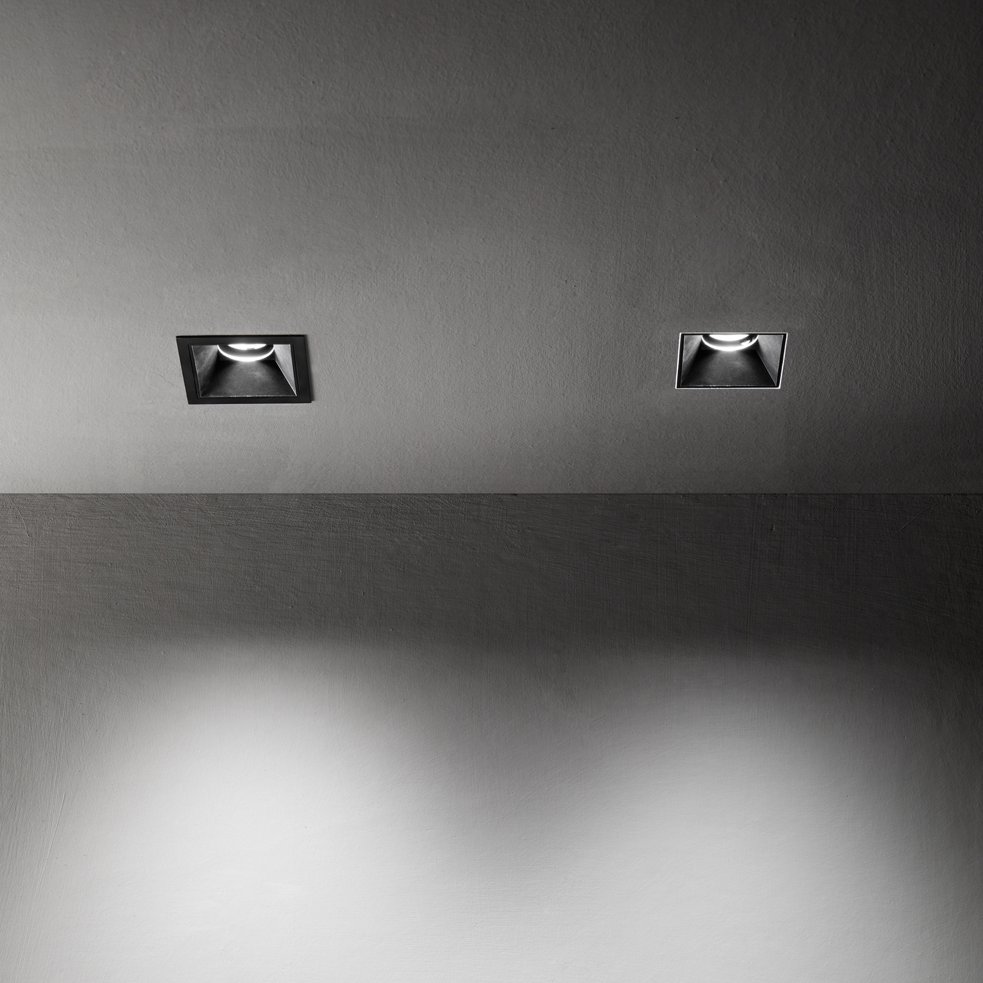 Sistema componibile di elementi ad incasso costituito da sorgente orientabile, riflettore e ghiera rotonda o quadrata, con lenti e accessori schermanti in opzione, finitura bianca e nera.